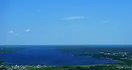 Lake Blouin (French: lac Blouin) is an ellipse shaped natural fresh water lake in the Abitibi-Témiscamingue Administrative Region, Quebec, Canada. The lake, oriented on a southwest–northeast axis, measures 13.5 km (8 mi) in length and has a maximum width of 2 km (1 mi).[2] It is relatively shallow with a maximum depth of 30 m (98 ft), and is located just north of the city of Val-d’Or, Quebec. It is fed by the Bourlamaque and Senneville rivers and is the headwater of the Harricana River. All three rivers are situated near its northeastern end. The shore of lake Blouin is lined with small rocky outcrops and sandy beaches. The lake lies within the Clay Belt, a vast tract of fairly flat land with fertile soil covering 180,000 km2 (69,000 sq mi) in northwest Quebec and northeast Ontario.[3]