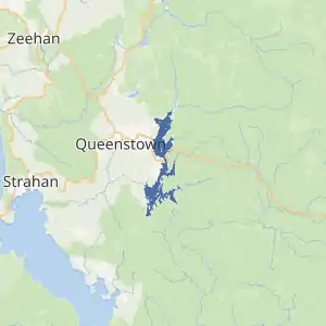 The lake lies to the west of the Franklin-Gordon Wild Rivers National Park and has a series of buffer zone conservation areas; the Princess River Conservation Area and the Crotty Conservation Area on the east shore, and the West Coast Range Regional Reserve on the west. The Hydro Tasmania jurisdiction of the lake is to the 242-metre (794 ft) elevation (the full supply level being 235 metres (771 ft)) round the edge of the lake, as well as the island created by the impoundment.[6][7]