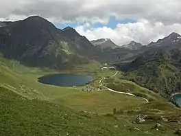 Lake Cadagno (Italian: Lago di Cadagno) is a meromictic lake in the Piora valley (canton of Ticino), Switzerland. As one of a few meromictic lakes in Europe, it is the object of numerous scientific studies. The Piora valley - located in the Saint-Gotthard Massif (central Swiss Alps) in the Southern part of Switzerland near Airolo at an altitude of 1921 m above sea level - is a landlocked alpine valley whose scientific value has been recognized for more than two centuries. In the past, the lake was used as a reservoir.