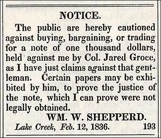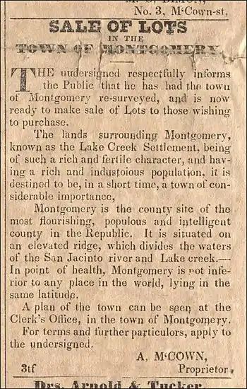 In 1837, W. W. Shepperd, in association with John Wyatt Moody, founded the town of Montgomery, Texas at the site of W. W. Shepperd's store in the middle of the Lake Creek Settlement. J. W. Moody was the First Auditor of the Republic of Texas and had been the Auditor of the Provisional Government of Texas during the Texas Revolution. Prior to his arrival in Texas, J. W. Moody had been the County Clerk of Montgomery County, Alabama.[23] Notice of the founding of the town of Montgomery first appeared in an advertisement placed in the July 8, 1837 edition of the Telegraph and Texas Register newspaper published in Houston, Texas.[24]
