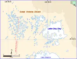 It is normally dry, except during and after periods of heavy rainfall. It is part of the geological basin known as the Officer Basin. The larger Carle Thulka is to the south. Since 1985, Lake Dey Dey is part of the lands belonging to the Maralinga Tjarutja, a southern branch of the Pitjantjatjara.[1][2] The community of Oak Valley is located nearby to the southwest.[1]