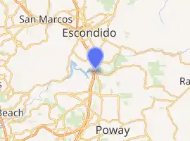 ![]() Lake Hodges Bridge (background) and David Kreitzer Lake Hodges Bicycle Pedestrian Bridge (foreground), as seen from Bernardo Mountain, facing east | |