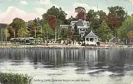 In the late 1800s, the Danbury and Bethel Street Railway, which owned the shortest electrified trolley system in Connecticut, purchased 12 acres (4.9 ha) of land on Lake Kenosia to build an amusement park.[4] The company extended their trolley line to the lake, and opened Lake Kenosia Amusement Park in 1895.[4] The park featured a wooden roller coaster, a carousel, a 1,000 seat open-air performance center, and the three-story Kenmere Resort Hotel.[4] A 30-seat steamboat called Montgomery was brought to the lake, where it became "problematic because it was far too big for Lake Kenosia".[4] Fire destroyed the hotel in 1927, and the park's popularity diminished following the opening of Candlewood Lake in the 1920s.[4]