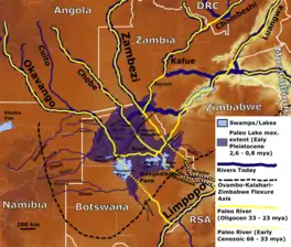 Approximately 3 million years ago, strong easterly winds formed long dunes, which ran from east to west across the middle of the Kalahari Desert. During wetter times, these dunes channeled the great rivers of the area, the Okavango, Chobe, and Upper Zambezi, southeastward to join with the Limpopo River and drain into the Indian Ocean. [4]