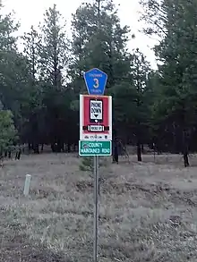 Lake Mary Road, sometimes referred to as Forest Highway 3, is known for its recreational opportunities, as it runs through pine forest areas and past three northern Arizona lakes.[2] It is also renowned for its gently rolling hills and wide roadway shoulders, making bicycling along the road attractive.[3] The road has also become a destination for recreational runners, because the road has wide shoulders and easy access to trail-heads and parking spots.[4] The road maintains a minimum elevation of approximately 6,730 feet (2,050 m) above sea level for its entire length, while its peak elevation is over 7,500 feet (2,300 m) above sea level.[5]