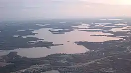 Lake Minnetonka (Dakota: Mní iá Tháŋka[1]) is a lake located approximately 15 miles (24 km) west-southwest of Minneapolis, Minnesota. Lake Minnetonka has about 23 named bays and areas.[2] The lake lies within Hennepin and Carver counties and is surrounded by 13 incorporated municipalities. At 14,528 acres (5,879 ha), it is Minnesota's ninth largest lake. It is a popular spot for local boaters, sailors, and fishermen.[3]
