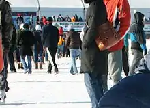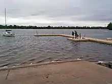 Lake Nokomis is one of several lakes in Minneapolis, Minnesota, United States. The lake was previously named Lake Amelia in honor of Captain George Gooding's daughter, Amelia, in 1819. Its current name was adopted in 1910 to honor Nokomis, grandmother of Hiawatha.[1] It is located in the southern part of the city, west of the Mississippi River and south of Lake Hiawatha. The lake is oval in shape, with a long axis running southwest to northeast. Two pathways circle the lake, a 2.7-mile (4.3 km) pedestrian trail and a 2.8-mile (4.5 km) bicycle trail.[2] Because the lower part of the lake is crossed by Cedar Avenue running north-south, the impression from the ground is that the lake is shaped like an L. The lake has an area of 204 acres (0.83 km2).