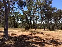 The natural vegetation within the catchment area is jarrah forest (Eucalyptus marginata) and mixed jarrah, wandoo, and swamp yate open woodlands with wide swampy drainage lines that have paperbark (species of Melaleuca) and banksia woodlands and sedge swamps, while sandy flats surrounding them have a low-density mix of jarrah, marri (Eucalyptus calophylla), wandoo (Eucalyptus wandoo) and swamp yate (Eucalyptus occidentalis). Most of the catchment has been cleared for agricultural development.[3] Around the lake the overstorey is dominated by Eucalyptus wandoo while the mid-storey contains Melaleuca cuticularis with a sparse understorey of Baumea juncea. A seagrass, Ruppia megacarpa, and species of stoneworts of the genus Nitella are also common in the wetlands.[4]