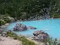 The strong turquoise color is dust from the glacier. The lake can only be reached by foot or by helicopter. The hiking trail has a length of 10.5 km[1] and takes 1.5 hours one way starting from Passo tre Croci.