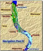 Lake Winneshiek is the name given to that portion of Navigation Pool 9 impounded by Lock and Dam No. 9 between the dam to 4 miles south of the city of Lansing, Iowa on the Upper Mississippi River, near Ferryville, Wisconsin.[1] It encompasses about 6,000 acres (24 km²) and is part of the Upper Mississippi River National Wildlife and Fish Refuge. The Army Corps of Engineers has proposed constructing some islands in the lake in order to improve wildlife habitat.[2]