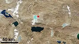 Zabuye Lake is a hypersaline, landlocked soda lake located at an elevation of 4,400 metres (14,400 ft) in the Shigatse Prefecture of Tibet Autonomous Region, 1,050 km (650 mi) from Lhasa. The lake gives its name to the mineral zabuyelite (lithium carbonate, Li2CO3), which was discovered here in 1987 and has been mined since 2004–2005. In 2008, the salt mine at the lake was regarded as the major source of lithium in China.[3][4][5]