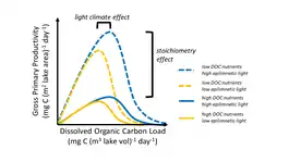 Primary and secondary consumers in lakes require organic matter (either from plants or animals) to maintain organismal function. Organic matter including tree leaves, dissolved organic matter, and algae provide essential resources to these consumers and in the process increase lake ecosystem respiration rates in the conversion of organic matter to cellular growth and organismal maintenance. Some sources of organic matter may impact the availability of other constituents. For example, dissolved organic matter often darkens lake water which reduces the amount of light available in the lake, thus reducing primary production. However, increases in organic matter loading to a lake can also increase nutrients that are associated with the organic matter, which can stimulate primary production and respiration. Increased dissolved organic matter loading can create tradeoffs between increasing light limitation and release from nutrient limitation. This tradeoff can create non-linear relationships between lake primary production and dissolved organic matter loading based on how much nutrients are associated with the organic matter and how quickly the dissolved organic matter blocks out light in the water column.[32][33][34][35] This is because at low dissolved organic matter concentrations as dissolved organic matter concentration increases, increased associated nutrients enhances GPP.[32][33][34] But as dissolved organic matter continues to increase, the reduction in light from the darkening of the lake water suppresses GPP as light becomes the limiting resource for primary productivity.[32][33][34] Differences in the magnitude and location of maximum GPP in response to increased DOC load are hypothesized to arise based on the ratio of DOC to nutrients coming into the lake as well as the effect of DOC on lake light climate.[34][36] The darkening of the lake water can also change thermal regimes within the lake as darker waters typically mean that warmer waters remain at the top of the lake while cooler waters are at the bottom. This change in heat energy distribution can impact the rates of pelagic and benthic productivity (see Temperature above), and change water column stability, with impacts on vertical distribution of nutrients, therefore having effects on vertical distribution of metabolic rates.