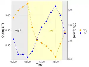 Lake metabolism represents a lake's balance between carbon fixation (gross primary production) and biological carbon oxidation (ecosystem respiration).[1] Whole-lake metabolism includes the carbon fixation and oxidation from all organism within the lake, from bacteria to fishes, and is typically estimated by measuring changes in dissolved oxygen or carbon dioxide throughout the day.[2]