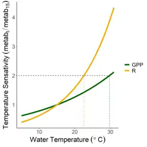 On a daily scale, GPP rates are most affected by the diel cycle of photosynthetically active radiation while ER is largely affected by changes in water temperature.[53] Additionally, ER rates are also tied to the quantity or quality of the organic substrate and relative contributions of autotrophic and heterotrophic respiration, as indicated by studies of the patterns of night-time respiration (e.g Sadro et al 2014[10]). For example, bacterioplankton respiration can be higher during the day and in the first hours of the night, due to the higher availability of labile dissolved organic matter produced by phytoplankton. As the sun rises, there is a rapid increase in primary production in the lake, often making it autotrophic (NEP > 0) and reducing dissolved CO2 that was produced from carbon mineralization that occurred during the night. This behavior continues until reaching a peak in NEP, typically around the maximum light availability. Then there is a tendency for the NEP to fall steadily between the hours of maximum light availability until the next day's sunrise.