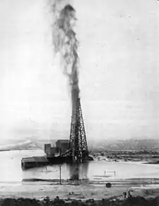 Early twentieth-century drilling technology lacked such modern safety features as blowout preventers. When drilling reached a well depth of 2,440 ft (740 m) on 15 March 1910,[5] pressurized oil blew through the well casing above the bit. An estimated 9 million barrels (1.4×10^6 m3) escaped before the gusher was brought under control in September 1911.[6]