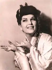 In 1976, she was awarded People's Artist of the USSR, the highest artistic honour of the time. Later she became a deputy of the Supreme Soviet of the USSR (1979–1984). The singer was constantly invited to official state and private solo concerts, where among her listeners were Nikita Khrushchev, Leonid Brezhnev, Josip Broz Tito, Indira Gandhi, François Mitterrand, John F. Kennedy, Fidel Castro, Gustáv Husák, Yuri Gagarin, Todor Zhivkov, Erich Honecker, Nicolae Ceaușescu, János Kádár, Mikhail Gorbachev, Eduard Shevardnadze, and many others. She was a frequent guest on the state television shows such as Blue Light, Morning Post, Music Mail, and others. The name of Lamara Chkonia is included in the Great Soviet Encyclopedia.[1] Her repertoire consists of about 40 opera parts, including Violetta (Video on YouTube), Madame Butterfly (Video on YouTube), Gilda, Marguerite, Rosina (Video on YouTube), and many others.