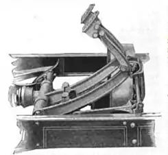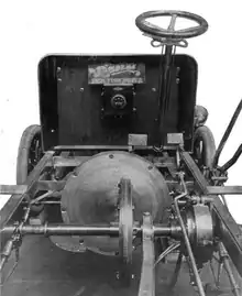 The speed adjustment was done by a mechanical device carrying a U-shaped rod to control the chiseled etched hub rim on the active propulsive wheel at one end by engaging it.[14] The other end of the metal link was to the accelerator and reversing lever controlled by the driver. The friction slave wheel disk is operated by the driver's foot pedal and friction is applied by the pressure that the driver applies. This forces the slave wheel rim into contact with the main motor flywheel disk transferring power onto this wheel's jack-shaft. When the driver no longer applies foot pressure a heavy duty spring automatically throws the slave disk back where it no longer is in contact with the main flywheel power disk.[14]
