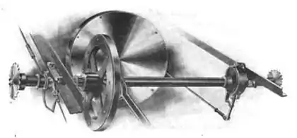 The master flywheel disk or driving wheel from the automobile engine was overlaid with a disk facing of aluminum that could be replaced. The driven disk had a rim of elastic fiber of either paper or wood that was engaged and wore for about 3000 miles of driving before it had to be replaced.[11] Lambert found that the combination of aluminum and fibrous material bearing surfaces gave the maximum degree of traction efficiency and had a good sturdiness over time for wear on the materials. Toothed gears on the other hand had to be in very close contact with each other at all times to be efficient and not slip. That caused the friction surfaces of the teeth to be exposed to great strains and wore out the gears quicker than the friction drive transmission.[12][13]