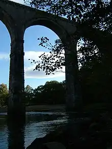 Lambley viaduct crosses the River South Tyne as a series of elegant stone arches. More than 260 m (850 ft) long, it once carried the Haltwhistle to Alston railway. The railway, which was opened in 1852 to haul coal and lead from the Alston mines, closed in 1976, and the viaduct was allowed to decay.[2] In 1991 the British Rail Property Board agreed to repair the viaduct and hand it over to the North Pennine Heritage Trust which would maintain it in the future; however the Trust went into administration in 2011.[3]