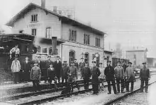 At the beginning of the twentieth century, the station had ticket gates like other stations in the Palatinate.[19][20] During this time, the station was managed by the operations and construction inspectorate (Betriebs- und Bauinspektion) of Neustadt an der Haardt and was the site of a Bahnmeisterei (office of the supervisor of track maintenance).[21] The Königliche Eisenbahndirektion (Royal railway division of Ludwigshafen, which was established when the Palatine Ludwig Railway Company (Pfälzische Ludwigsbahn-Gesellschaft) was taken over by the Royal Bavarian State Railways (Königliche Bayerische Staats-Eisenbahnen) in 1909, became the Reichsbahndirektion (Reichsbahn division) of Ludwigshafen after the founding of the Deutsche Reichsbahn in 1922. A year later, the railway workers employed at the railway station were expelled during the operation of the railway by the French military during the occupation of the Palatinate by France. They then returned to work.[22] During the dissolution of the railway division of Ludwigshafen on 1 April 1936, it was transferred to the railway division of Mainz and the Betriebsamtes (RBA) Neustadt (operations office of Neustadt).[23][24][25]