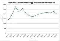 The highest seasonal average for Stevenage at Broadhall Way since the club was promoted to the Football Conference in 1994 is 2,748, during the club's 1996–97 campaign.[39] This seasonal average was beaten when the club were promoted into the Football League for the 2010–11 season, averaging 2,960 fans during their first ever season as a Football League team.[40] Attendances continued to improve the following season, in the club's first League One campaign, with the seasonal average sitting at 3,559, the first time the club had averaged over 3,000 spectators.[41] The season was also the first time that over 100,000 fans attended games at Broadhall Way.[42] This figure showed a significant rise in the club's attendances, as it was over double the number of fans who attended games at the stadium during the 2008–09 season.[42] The lowest overall average attendance while the club has been in the top five tiers of English football was in the side's first year in the Conference, in 1994–95, averaging 1,415.[37]