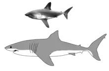 The salmon shark (Lamna ditropis) is a species of mackerel shark found in the northern Pacific ocean. As an apex predator, the salmon shark feeds on salmon, squid, sablefish, and herring.[2] It is known for its ability to maintain stomach temperature (homeothermy),[3] which is unusual among fish. This shark has not been demonstrated to maintain a constant body temperature. It is also known for an unexplained variability in the sex ratio between eastern and western populations in the northern Pacific.[4]