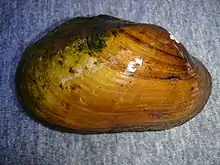 This mussel, a bivalve mollusc in family Unionidae, is oblong oval in shape and can reach over 10 centimeters in length. The shell is brownish to olive green to tawny in color on the outside and iridescent bluish white on the inner surface. The back end of the shell of the male is pointed and that of the female is rounded.[2]