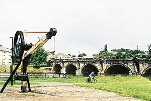 The Greyhound Bridge was converted for use by the A589 road from 1972.[10][11] The site of Green Ayre station is now a public park. Nothing remains of the station,[12] but a goods crane from Hornby goods shed has been erected in the park near the site.[10][13] The site of the adjacent locomotive shed is now occupied by a supermarket.
