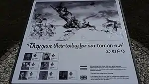In due course of time the crash site came a bit forgotten. Until in 2013 the local liberation committee took initiative to mark the site with a small sign. It was unveiled in the middle of the night on 1:45 hours, exactly 70 years after the incident.[7][9] The sign started to serve as a small memorial where annually two remembrances take place. The first is on 4 May, preceding the national and local Remembrance of the Dead. At 18:30 hours there is a ceremony where the crew is honored. Every year on the fourth Wednesday of July, the International Four Days Marches Nijmegen pass through Beuningen. On this day there is a ceremony by soldiers from the British Military who take part in the Marches.