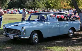 The first Flaminia berlina was revealed at the Turin Auto Show in March 1957. It differed from the production version by having Florida-inspired suicide rear doors that opened opposite to the front doors.[4] All the other versions have front-hinged doors. The saloon version of the car was generally designated by the Italian word for this body style, Berlina. Designed by Pininfarina and based on the Florida I prototype, this was the only body to be built by Lancia themselves, as well as becoming the only body to last through the entire production period. There were 3,344 Berlinas built with the 2.5 L engine (102/110 bhp specification), and additional 599 with the 2.8 L (128 bhp). They were assembled at Lancia's old facility at Borgo San Paolo as the last model to be built there.[2][3]