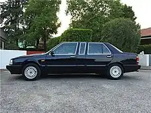 Built only on request by wealthy customers and Fiat-Group executives, the Lancia Thema Limousine featured the same interior as the LX and the 8.32 versions. Most of them were powered by a 2.8 L PRV V6 engine, replaced in the last ones by the 3.0 L Alfa Romeo V6 engine. Only 24 Thema Limousines were built.[23] The wheelbase of the car was extended by 30 cm (1 ft) to 2,960 mm (116.5 in), with a resulting overall length of 4,890 mm (192.5 in). The weight increased to 1,400 kg (3,090 lb), or by just over one fifth. The price, meanwhile, was up nearly sixty percent over a comparably equipped regular wheelbase Thema V6.[24]