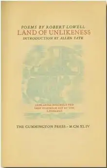 Land of Unlikeness, Robert Lowell's first book of poetry, was published in 1944 in a limited edition of two hundred and fifty copies by Harry Duncan at the Cummington Press. The poems were all metered, often rhymed, and very much informed by Lowell's recent conversion to Catholicism.