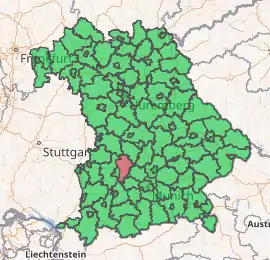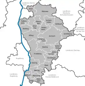 Aichach-Friedberg is a Landkreis (district) in Bavaria, Germany. It is bounded by (from the northwest and clockwise) the districts of Augsburg, Donau-Ries, Neuburg-Schrobenhausen, Pfaffenhofen, Dachau, Fürstenfeldbruck and Landsberg, as well as by the city of Augsburg.