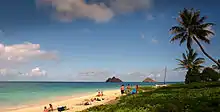 Lanikai Beach or Kaʻōhao Beach is located in Kaʻōhao, a community in the town of Kailua and on the windward coast of Oahu, Hawaii. Although there is a widespread belief that the name Lanikai means "heavenly sea",[1] that is a misconception and a grammatical error, since in the Hawaiian language, the qualifier (lani) comes after the noun (kai). The name Lanikai was invented in the 1920s by the developer Charles Frazier, who owned 300 acres of beachfront property in the area known to Native Hawaiians as Kaʻōhao.[2] This small half-mile strip of beach is consistently ranked among the best beaches in the world.[3] Adjacent to Lanikai Beach is a primarily upper-class residential area and because of this it is accessed through public beach access paths. Although the beach itself is public property, it is not state land and is not a county beach park like many beaches in Hawaii. There is no public parking lot and the area lacks facilities like restrooms, showers or lifeguards.[4] As of July 1, 2014, parking violation fines have increased from $35 to $200 in an effort to keep people from illegally parking in the residential area surrounding the beach accesses. Parking violations are strictly enforced and include, but are not limited to, no parking within four feet of a driveway entrance or apron, blocking the unimproved pedestrian right of way (where a sidewalk would normally be), within 30 feet of a stop sign, within ten feet of a fire hydrant, or on or within 20 feet of a crosswalk. However, there are legal parking areas in downtown Kailua.
