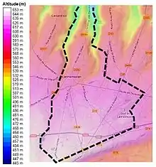 Changes in altitude are important on the territory of the commune. The minimum altitude is 442 metres (1,450 ft), the maximum altitude is 647 metres (2,123 ft). The average elevation is 545 metres (1,788 ft), and the Town Hall lies Meanwhile, 580 metres (1,900 ft).[4]