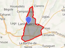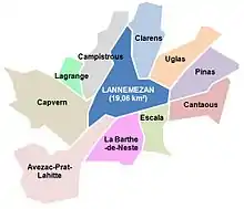 Spatially, Lannemezan is wedged between the following nine communes: Campistrous to the northwest, Clarens in the northeast, Capvern to the west, Uglas and Pinas to the east, Avezac-Prat-Lahitte in the southwest, La Barthe-de-Neste and Escala to the south, and Cantaous to the southeast.[5]