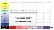 In all cases, the soils are rather acidic type with adjustable humidity, which imposes certain constraints for the development of plant species. These development constraints are represented on the adjoining humidity/acidity chart.