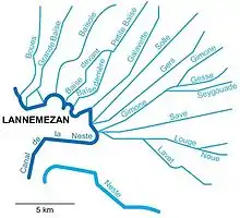 Eighteen rivers have their sources on the Plateau de Lannemezan or pass through the territory of the commune. The main are listed in the following table.