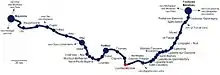 | Distance | 37 km (23 mi) | 126 km (78 mi) | 190 km (120 mi) | 268 km (167 mi) | 359 km (223 mi) | 524 km (326 mi) | 609 km (378 mi) | 656 km (408 mi) | 688 km (428 mi) | 801 km (498 mi) | 907 km (564 mi) | 1,017 km (632 mi) | 1,147 km (713 mi) |