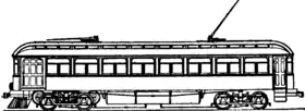 On February 3, 1902, the company completed a 18.5-mile (29.8 km) line as far as St. Johns. On entering Lansing trains joined the Cedar Street line of the local streetcar system. The electrical systems were not yet ready, so the railroad was operated by steam locomotives supplied by the Michigan Suburban Railroad. Arnold's account states that steam service began on November 15, 1901; Meints puts the completion of the line in February 1902.[2][3] Construction of the overhead lines was finished by December 1902, and tests began the following March. The first trial trips occurred on June 15, 1903, using a specially-built experimental locomotive. The company had ordered three interurban cars from the Jewett Car Company of Jewett, Ohio. These were of wooden construction, 56 feet 5 inches (17.20 m) in length, capable of seating 50 passengers, but at that stage Arnold's experimental motor lacked the motive power to drive them. A new locomotive fitted with two motors was readied for tests in early December, but a fire swept through the company's car house, destroying the locomotive, two of the Jewett cars, and a steam locomotive. While engineers constructed a new locomotive, "Phoenix," the company rebuilt the line to permit DC operation, thereby allowing Lansing streetcars to operate over it. On August 3, 1904, the new locomotive made a trial run of 8 miles (13 km) out to DeWitt. A blown circuit breaker ended the test prematurely.[4][5]