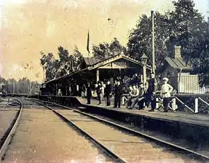 The first wooden station building was constructed in 1869[1] by architect Wolmar Westling.[3][4] The first train has solemnly proceeded through it on July 3 [O.S. June 22] 1869.[5] It has been located a little in the heart of building and before it there was a place for transport. The facilities is located to the address 3, Serdobolskaya street. Through movement on all extent of a line between two capitals was opened personally by emperor Alexander II September 12 [O.S. August 30] 1870.[6]