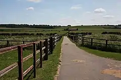 Track to grazing land. This track and fields belong to Lanwades Stud and are used by racehorses for grazing.