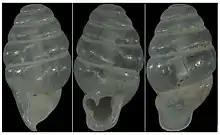 The tiny shell has a height of 1.8 mm and a width of 1 mm. The white, glossy, transparent shell is compact and less elongated with fewer whorls compared to Laoennea carychioides.[2] The apical part of the shell is dome-shaped. The conical-ovate shell possesses five convex whorls, which are separated by a deep suture. The next-to-last whorl is expanded and broader than the last whorl. The protoconch is not clearly discernible. The teleoconch shows streaks of uneven growth lines. The last whorl shows widely spaced ribs and radial striations. The opening (aperture) is heart-shaped, which is reinforced by a thick callus. The apertural dentition consists of two well-formed denticles, one on the palatal wall and the other one (parietal lamella) on the parietal wall, forming a round sinulus. The sinulus is in line with the rest of the aperture. Additionally, a low, weak columellar denticle is located close to the peristome. The peristome is expanded and slightly reflected. The shell has a straight central column (columella) and the umbilicus is visible as a small slit.[1]
