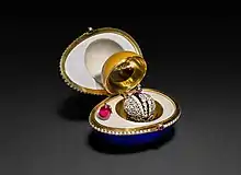 The Lapis Lazuli egg is a jewelled Fabergé egg, attributed to the House of Fabergé in St. Petersburg, Imperial Russia. Unlike many of the other Fabergé eggs, Lapis Lazuli was a private commission and isn't considered to be one of the imperial Easter eggs,[1] as it was never given to a Russian Tsarina.