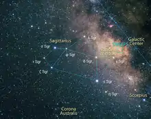The Galactic Center, which is obscured at visible wavelengths due to interstellar dust, lies about two degrees west of the Cloud.[4]