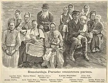 Larin Paraske (December 27, 1833 – January 3, 1904) was an Izhorian[1][2] oral poet. She is considered a key figure in Finnish folk poetry and has been called the "Finnish Mnemosyne".[3] Her frequent listeners included several romantic nationalist artists, such as Jean Sibelius, seeking inspiration from her interpretations of Kalevala, an epic poem compiled from Finnish folklore by Elias Lönnrot.[4]