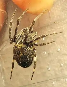 Larinioides sclopetarius, commonly called bridge spider or gray cross spider, is a relatively large orb-weaver spider with Holarctic distribution. These spiders are located in Europe and have been observed as south as the Mediterranean Coast and as north as Finland. They are often found on bridges, especially near light and over water.[1] The species tends to live on steel objects and is seldom seen on vegetation.[2] Females reach a body length of 10–14mm, and males 8–9mm.[1] Their orb webs can have diameters of up to 70 cm.