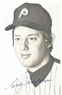 Christenson attended Marysville (WA) High School where he was noted more for his basketball than baseball skills. He struck out 143 batters in 72 innings and had an earned run average (ERA) of 0.28 in his senior year. He was selected third overall in the first round by the Phillies in the 1972 MLB draft just one day after his graduation.[1] A short time later, he began his professional career with the Phillies’ Minor League Baseball (MiLB) Pulaski Phillies of the Appalachian League. Both his first MiLB and MLB hits were home runs and he is tied with Rick Wise for most home runs (11) by a pitcher in Phillies history.