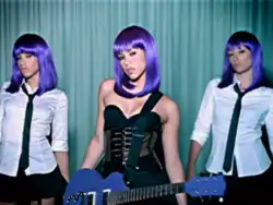 The music video for "Las de la Intuición" was filmed in Miami, Florida, under the direction of Shakira and Spanish photographer Jaume de Laiguana.[11][70] The concept of the clip was developed by the singer, who was inspired by the work of German-Australian photographer Helmut Newton.[11][71] Before its release, her publicists announced that she would appear with a new look, stating that, "Shakira has appeared with brown, red, straight and curly hair, but she has never been seen with a look like this."[72] The video depicts Shakira wearing a purple wig, garter belts and high heels while performing and dancing to the track in different outfits, such as a black corset, miniskirts, and a school-girl uniform.[67][73][74] In the first verse, the singer is looking at a mirror while applying perfume and lipstick. During the next verse, she holds a guitar and performs a choreography alongside four dancers dressed similarly to her. Later, they keep on dancing while showing in some occasions their underwear. By the end of the clip, she appears leaning against a layer of plastic and performing the track with a microphone.[75] It premiered worldwide on 7 May 2007,[72] and was released on the iTunes Store seven days later.[76] It was also included as a bonus clip on Shakira's third live album Oral Fixation Tour (2007).[77] Both the guitar and wig Shakira used in the music video were sold at auction in 2008 for US$3301.50, in benefit of the singer's Barefoot Foundation.[78]