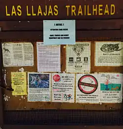 Llajas Canyon is home to fauna such as the Mountain lion, California badger, Red-tailed hawk, Ring-tailed cat, Virginia opossum, Gray fox, Coyote, Bobcat, Mule deer, Southern Pacific rattlesnake, and Barn owl.[15] The area was open for Mountain lion hunting as late as in 1934.[16] The flora consists of native shrubs, grasses, California sycamore, numerous oak trees, brush, vines, wildflowers, wild celery, watercress, cactus, palm trees, and more.